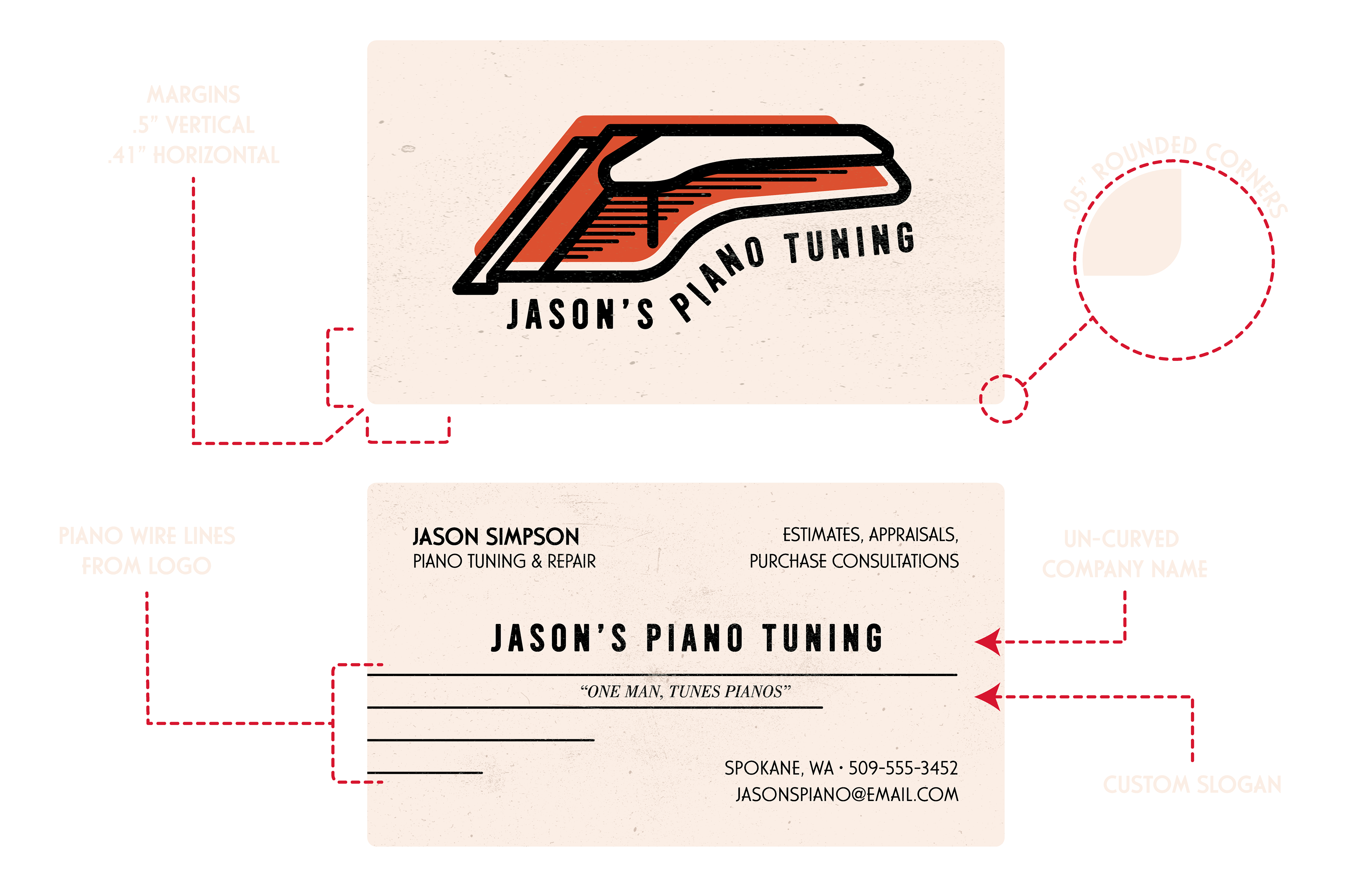 Upon researching different layouts, one thing that stuck out to me was that these cards tended to have the company slogan on them. Considering this client didn't have one, I pitched one with a pun that was well received: "One man, tunes pianos". This slogan is effective in brand clarity, swiftness, and humor - a perfect representation of this business.