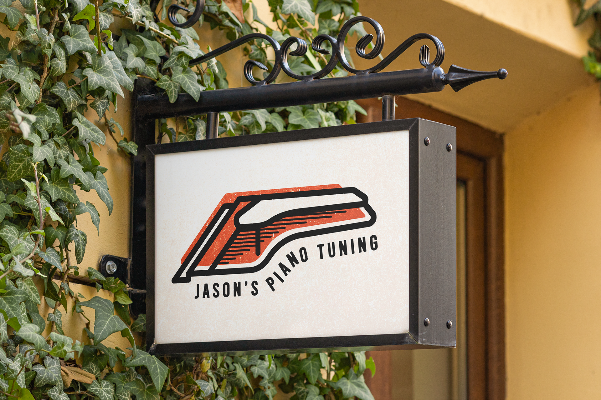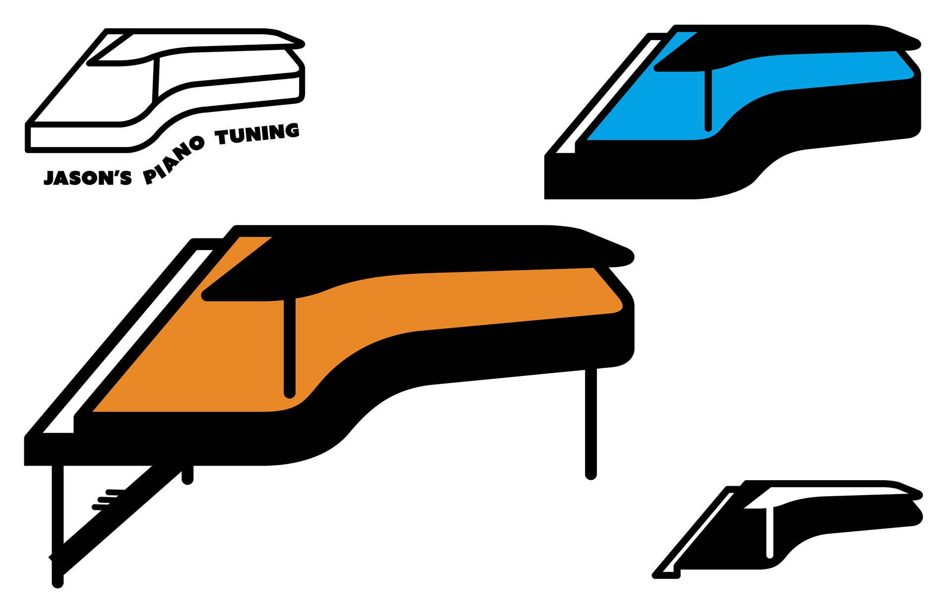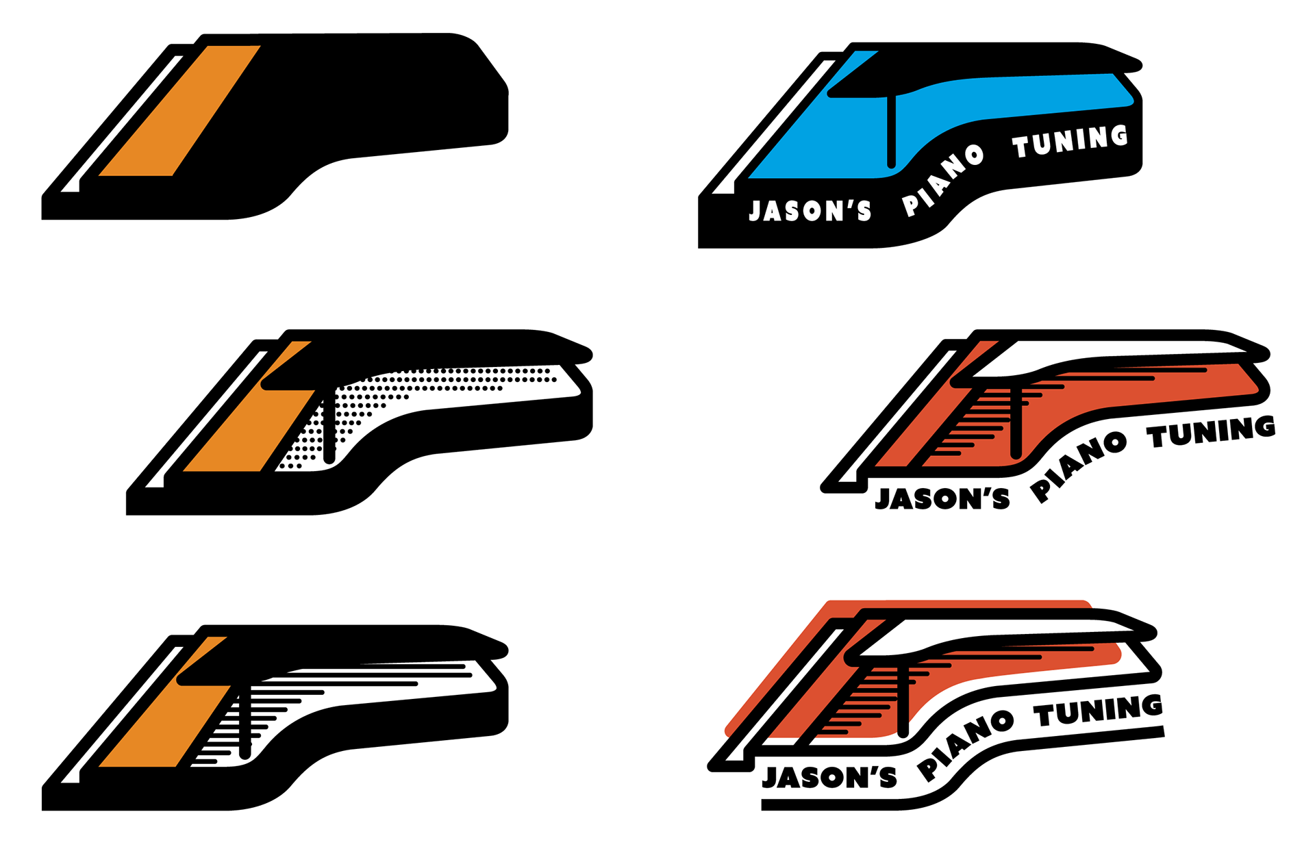 "Jason's Piano Tuning" follows the curve of the piano in a condensed block typeface. Although inspired by the often elegant cursive lettering of the dingbat buildings, I opted to go with a clearer typeface due to the length of the name and where the logo will be placed in the end - small areas like business cards and invoices. The letter placement around the curve has custom spacing and tilt, while the individual corners have been modified to be rounded in order to match the rounded edges of the art.