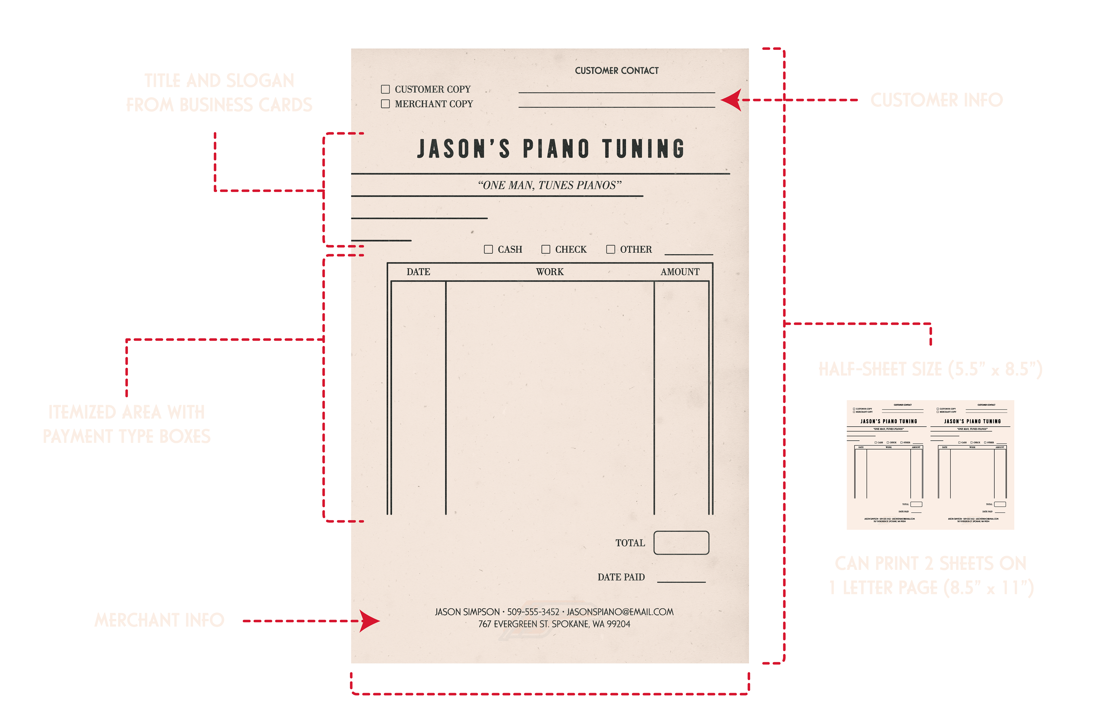 This client is a one-man operation, tuning pianos as a side gig only a handful of times a year. His clients are mainly people he already knows or those who have been referred through those original clients. With no online presence - and no desire or need for one - the main things required for this project are updated business cards (goodbye 20 year old clip art!) and invoice templates.