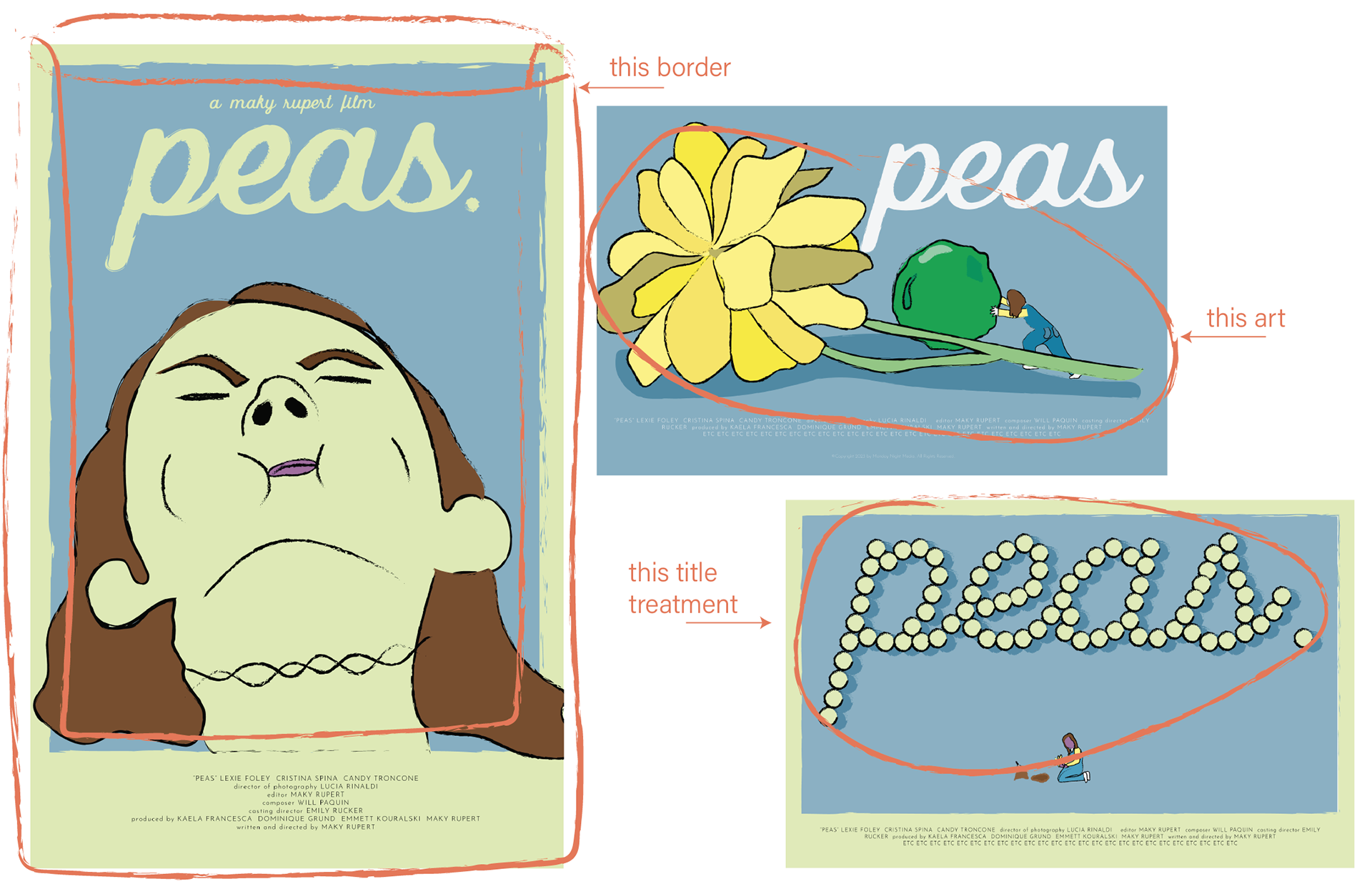 In response to these concepts, the production team ultimately decided that, first, they needed the poster in portrait format since that is the more common format in the industry. Second, they wanted to combine concepts from multiple posters into the finished product; namely the border from Rough 04, the "Peas" title style from Rough 02 and 03, and the main art from Rough 01.